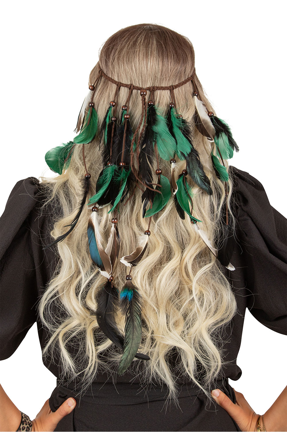 Of het nu voor een zomers festivalseizoen is of voor carnaval, dit hoofdbandje staat geweldig bij jouw Ibiza, Indianen of hippie outfit. De bohemian chic hippie stijl past perfect in de haren van elke festivalganger feestganger. Daarnaast is hij ook te gebruiken voor tijdens Carnaval! De hoofdband is verstelbaar met gevlochten veters en met o.a. groene veertjes met houten kraaltjes.